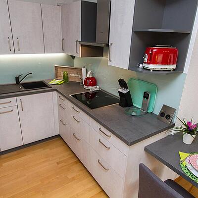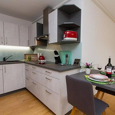 Apartment – Feuer 30 m² Personen Es erwartet Sie eine vollausgestatte Küche. Kulinarische Leckereien finden Sie jederzeit im Gemeinschaftsraum Feuerstelle.