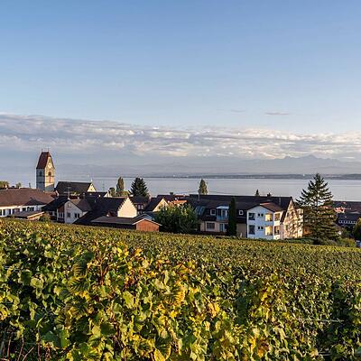 Der Weiterweg folgt anfangs dem „Immenstaader Apfel- und Weinspazierweg“ durch Obstplantagen und geht an der Frenkenbacher Kapelle St. Oswald und Otmar nahtlos in den „Hagnauer Obst- und Weinwanderweg“ über. Jetzt im Frühjahr steht die schlichte, überwiegend romanische Kirche aus dem 12. Jahrhundert inmitten eines zartrosa Blütenmeers. Auf den 25 Tafeln des Lehrpfads wird viel Interessantes zu Wein- und Obstanbau und zur Gemeinde Hagnau vermittelt. Es lohnt sich Zettel und Stift mitzunehmen, denn es werden auch Rezepte aus der Hagnauer Küche präsentiert. Von Frenkenbach geht es im Bogen durch Obstgärten und Reben, am Starenturm (mit Aussichtsplattform) vorbei, zur Wilhelmshöhe. Der Panoramapunkt sucht seinesgleichen: ausgebreitet liegen Hagnau, eingebettet in Rebhänge, und der Bodensee zu den Füßen. Bei klarer Sicht bildet die Alpenkette – allen voran der Säntis – das einmalige Panorama. Der Rückweg ist ein Spaziergang mit viel Aussicht. Durch die Weinberge geht es bergab, im Ort durch die Riedlegasse und über die B31 hinweg, zurück zum Ausgangspunkt.