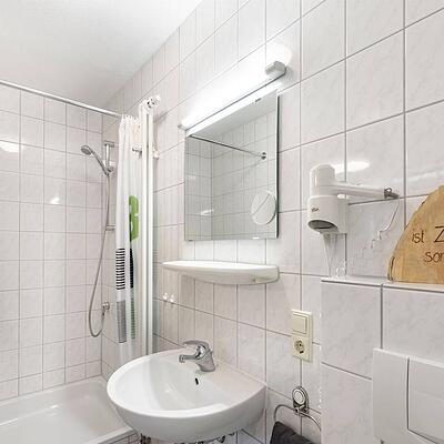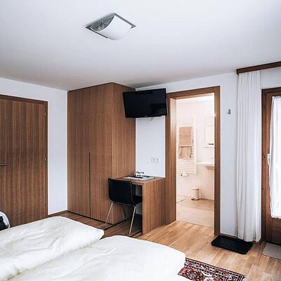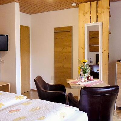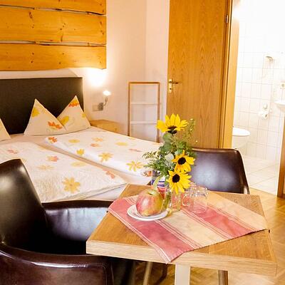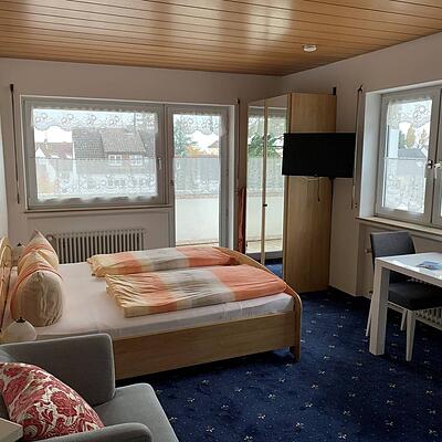 Doppelzimmer im 1.OG mit Balkon und Gartenmöbel. TV und kostenfreies WLAN. Dusche, Badewanne und WC. Tisch und Sitzmöglichkeit.